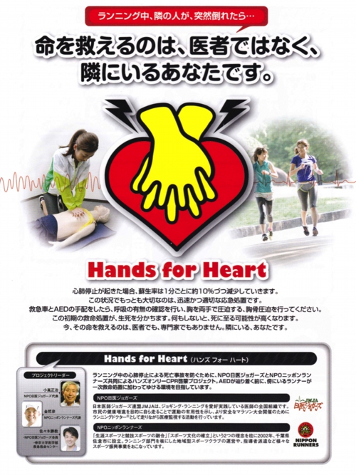 心肺停止が起きてから自動体外式除細動器(AED)が到着するまでの時間帯に、傍らにいる一般ランナーが一次救命処置に加わることができるように、国内のいくつかのマラソン大会において下記パンフレットの配布を行なっています。